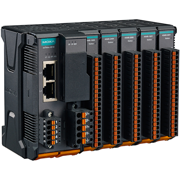 Moxa’s ioThinx 4500 Series (45MR) Modules are available with DI/Os, AIs, relays, RTDs, and other I/O types, giving users a wide variety of options to choose from and allowing them to select the I/O combination that best fits their target application. With its unique mechanical design, hardware installation and removal can be done easily without tools, greatly reducing the amount of time required to set up and replace the modules.
