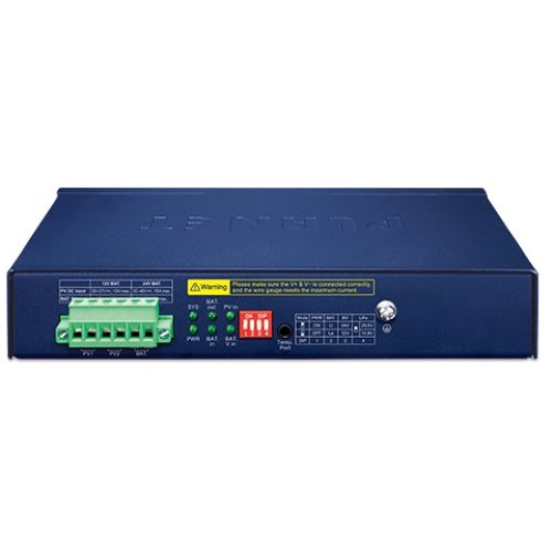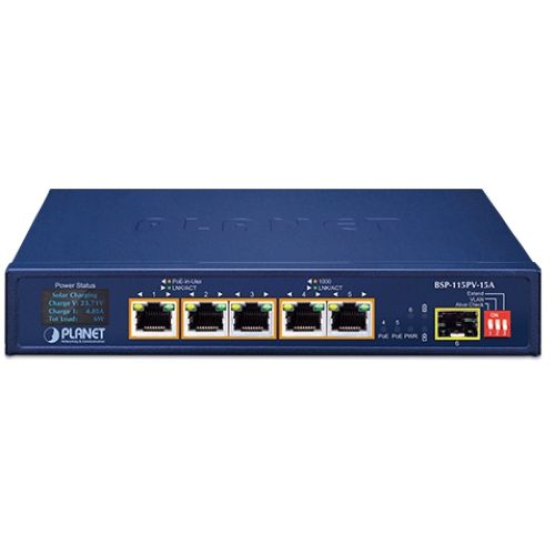 5-Port 802.3at PoE+ Solar PoE Switch with 1-Port 1000X SFP and LCD Display (-20~65 degrees C, 10/100/1000T RJ45 ports, 120W PoE budget, supports PD alive check, 250m PoE Extend and VLAN isolation, 12V/24V solar panel power input and 12V/24V battery char