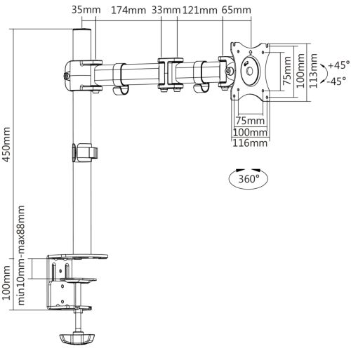 BRACCIO PER MONITOR 27" CON MORSETTO DUE SNODI FINO A VESA 100X100 8 KG