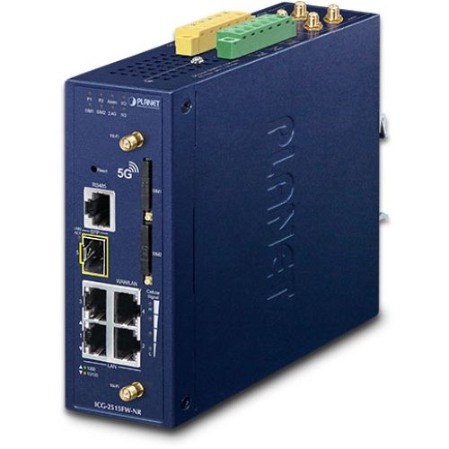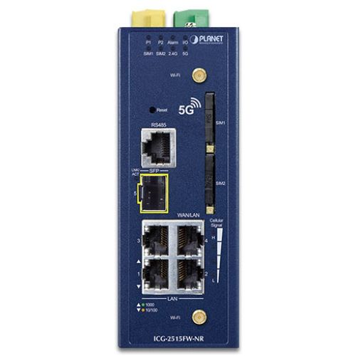 Industrial 5G NR Cellular Wireless Gateway with 1-Port 1000X SFP (Sub-6 5G NR Global Band, compatible with 4G LTE, 2 SIM Card Slots, 802.11ax 1800Mbps, 2.4GHz and 5GHz Dual Band concurrent, 4 10/100/1000T, 2 DI/DO, Dual DC 9~54V, -40~75 degrees C, SD-WAN