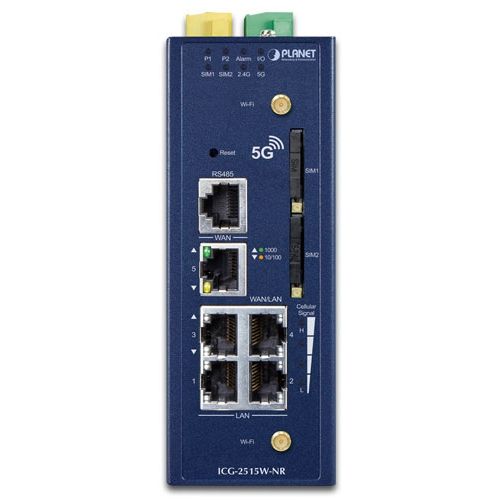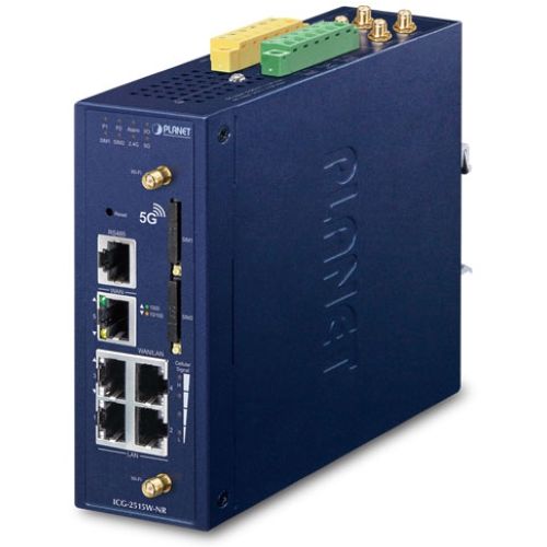 PLANET ICG-2515W-NR is an industrial-grade wireless cellular gateway for demanding mobile applications, M2M (machine-to-machine) and IoT deployments. Upgraded to the latest cellular technology of 5G NR (new radio), the ICG-2515W-NR is able to provide ultra-fast broadband access with 5G cellular network. The ICG-2515W-NR also features five Ethernet ports (4 LANs and 1 WAN), IEEE 11ax Wi-Fi capability, serial port (RS485), DI and DO interfaces, and VPN technology bundled in a compact yet rugged metal case. It establishes a fast cellular connection between Ethernet and serial port equipped devices. The ICG-2515W-NR is an integrated 5G NR and Wi-Fi 6 solution for industrial automation, digital factory and other industrial applications.