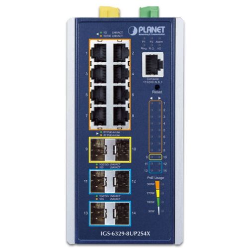IP30 DIN-rail Industrial L3 8-Port 10/100/1000T 802.3bt PoE + 2-port 1G/2.5G SFP + 4-Port 10G SFP+ Full Managed Switch (-40 to 75 C, 8-port 95W PoE++, 802.3bt/PoH/Force modes, DIDO, ERPS Ring, 1588 PTP TC, Modbus TCP, ONVIF, Cybersecurity features, Layer3