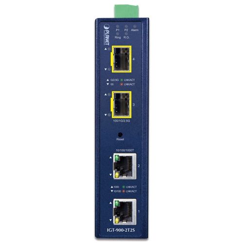 PLANET IGT-900-2T2S, a fully-managed Gigabit Media Converter for harsh environments, features two 10/100/1000Mbps copper ports, two 100/1000/2500X SFP ports and redundant power system in an IP30 rugged but compact-sized case. The IGT-900-2T2S can be installed in any difficult environment as it can operate stably under the temperature range from -40 to 75 degrees C. With such a slim enclosure, it does not need a big space to install. The switch features user-friendly yet advanced IPv6/IPv4 management interfaces, abundant L2/L4 switching functions and Layer 3 static routing capability. It allows either DIN-rail or wall mounting for efficient use of cabinet space. With SFP fiber slots, it can be flexibly applied to extend the connection distance.