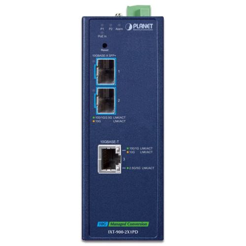 IP40 Industrial 2-Port 10G/1GBASE-X SFP+ + 1-Port 10G/5G/2.5G/1G/100BASE-T PoE PD Managed Media Converter(-40 to 75 C, dual redundant power input on 9~48V DC/24V AC terminal block, PoE PD, IPv4/IPv6 Dual stack management, supports TLSv1.2/SSHv2/SNMPv3 Cyb