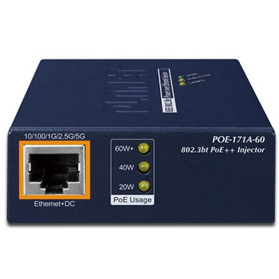 PLANET POE-171A-60 is a Single-Port, 802.3bt Power over Ethernet Injector with a maximum of up to 60 watts of power output over Ethernet cables. It is also equipped with two 10M/100M/1G/2.5G/5GBASE-T RJ45 copper interfaces to handle extremely large amounts of data transmission.