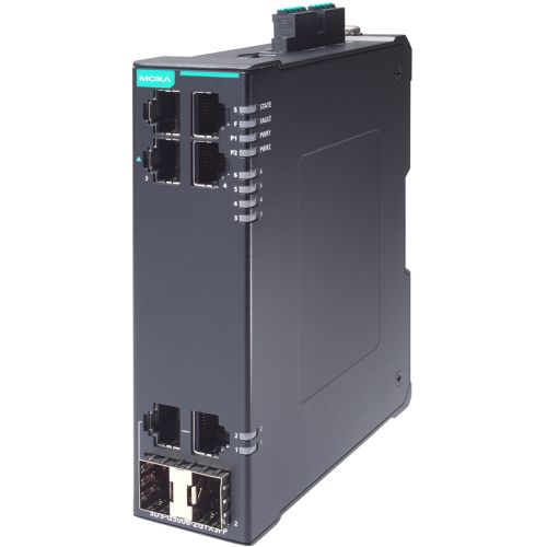 Compact industrial smart Ethernet switch with 4 10/100/1000BaseT(X) ports, 2 10/100/1000BaseT(X) or 100/1000BaseSFP combo ports, dual 12/24/48 VDC power inputs, -40 to 75°C operating temperature
