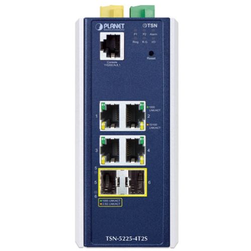 IP30 DIN-rail Industrial L2+ 4-Port 10/100/1000T + 2-Port 1G/2.5G SFP Managed TSN Switch (-40 to 75 C, dual redundant power input on 9~48VDC/24V AC terminal block, DIDO, Time-Sensitive Networking technology, 802.1AS Time Synchronization, hardware-based 15