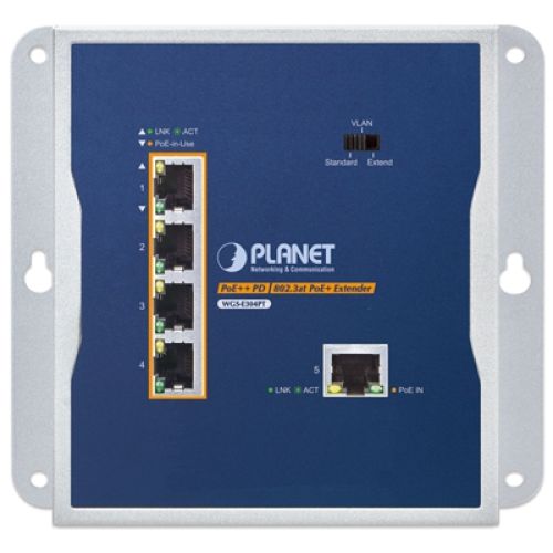 IP30 Industrial 1-Port 95W 802.3bt PoE++ to 4-Port 802.3at PoE+ Wall-mounted Extender (-40 to 75 C, Standard/VLAN/Extend mode, fanless desing, wall mounting, magnetic wall mounting or DIN-rail mounting)